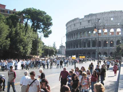A photo of a demonstration that passed by the Colosseum. The protestors were blowing whistles and it was hard on the ears. They were protesting increased real estate taxes in specific neighborhoods.